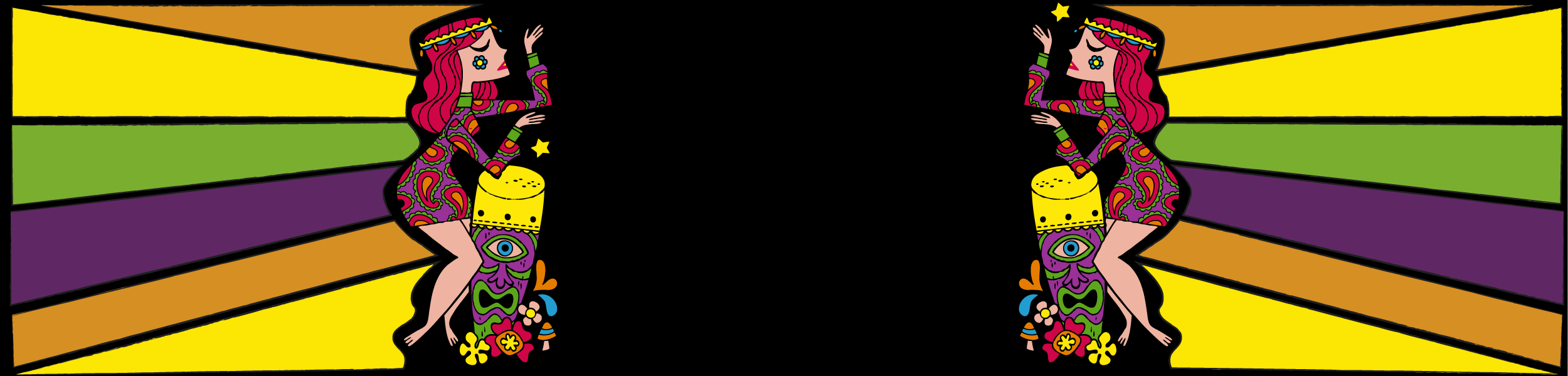 Climb aboard a magic carpet and set sail on an odyssey through an orbit of far out sounds, pop art design, and vibrant, swirling colors to a kaleidoscopic Pacific Island where Tikis are draped in diaphanous paisley fabrics and enormous tropical flowers bloom with the scent of incense and peppermints. The clock has burst, and time has no meaning…Where have you landed? Welcome to the land of Psychedelic Tiki. Colors shimmer, patterns swirl and flow, sounds of the East meet rhythms of the West…it’s a feast for the eyes…and an inner ear freakout! Can you dig it? Prepare to have your mind blown on this uncharted journey through a groovy blend of cosmic color and Psychedelia Tropicalia.
